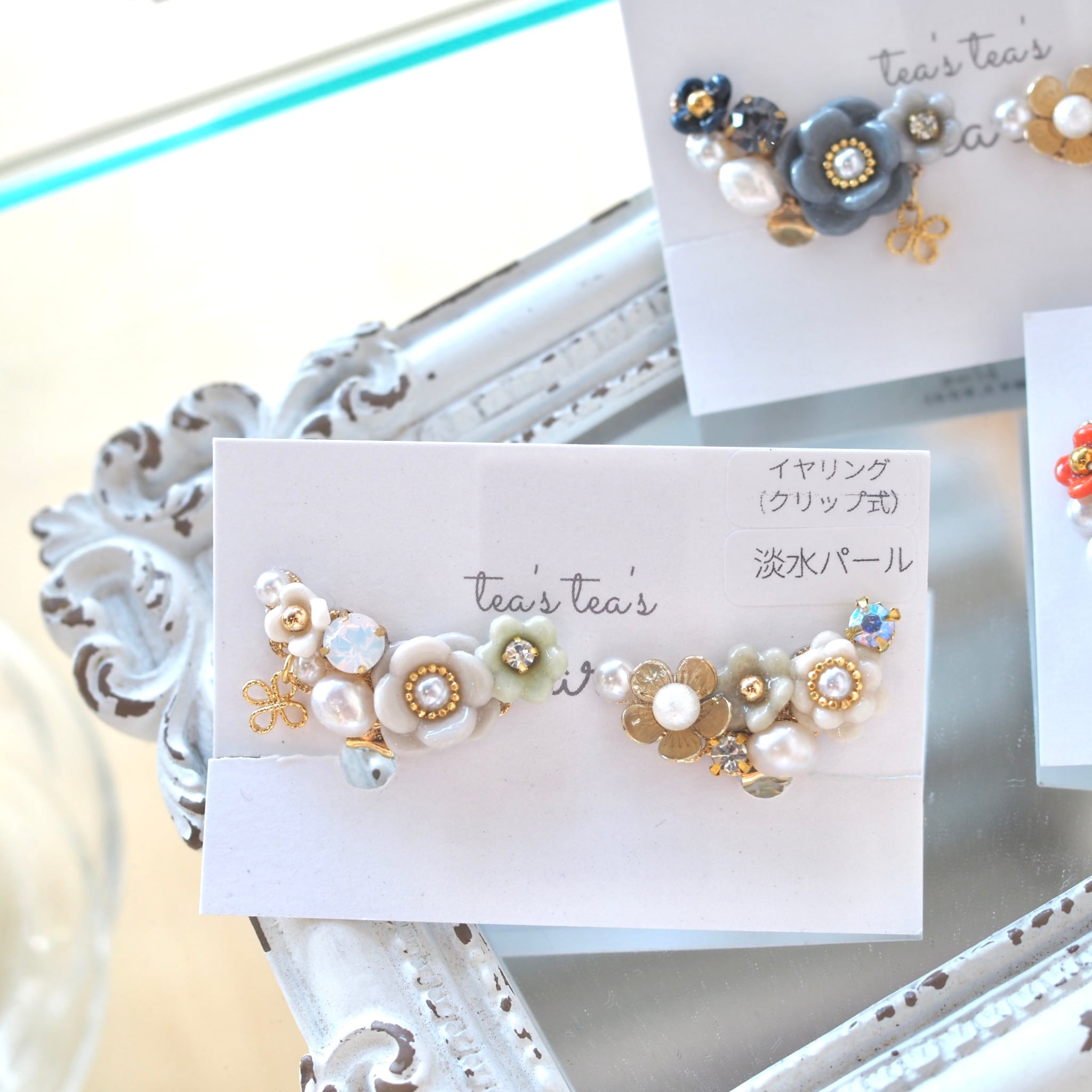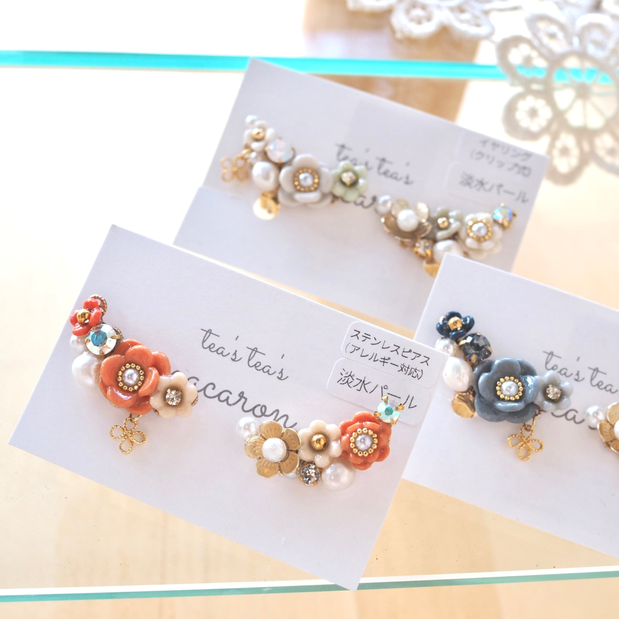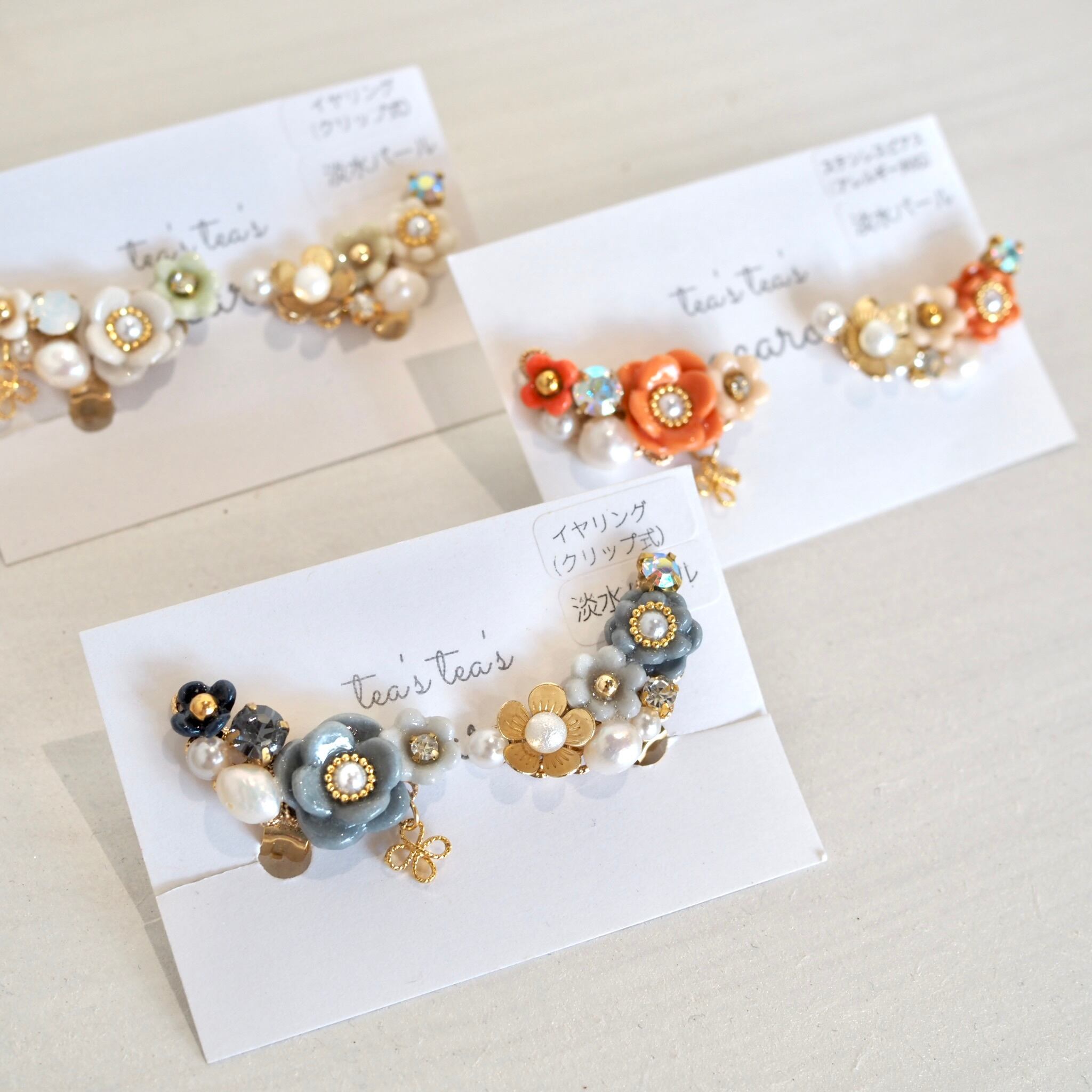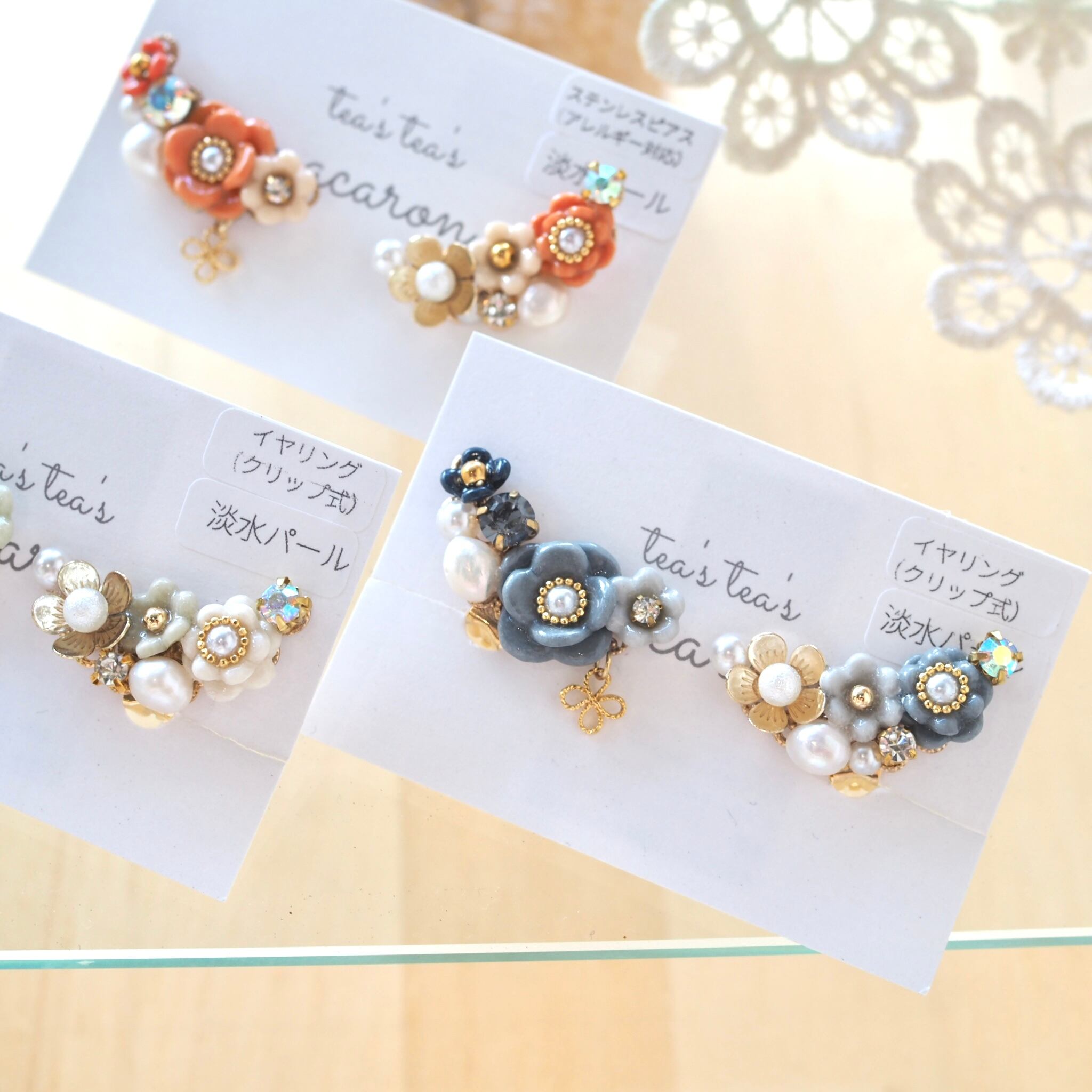 金具は、アレルギー対応のステンレスピアスor痛くなりにくいクリップ式イヤリングからお選びいただけます。