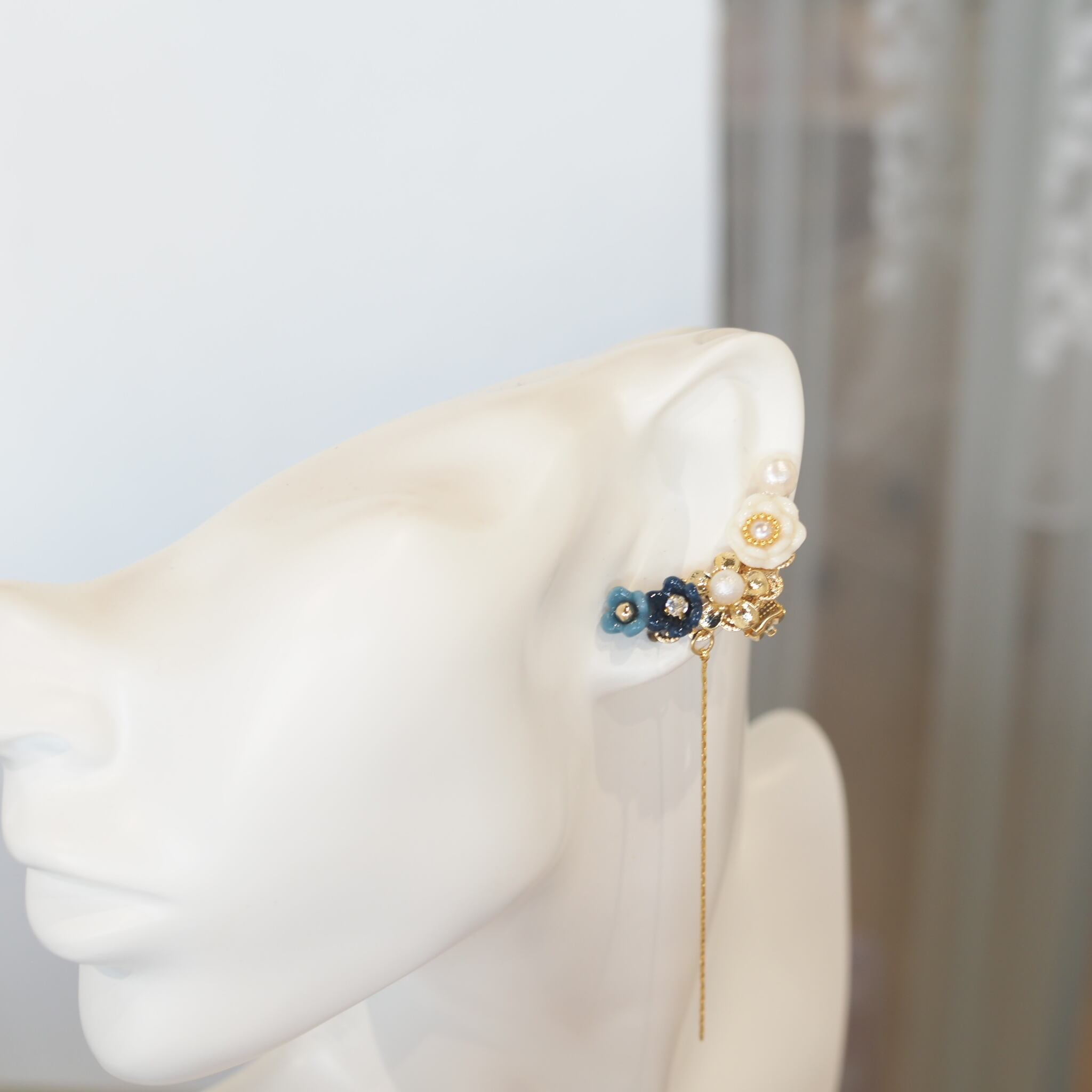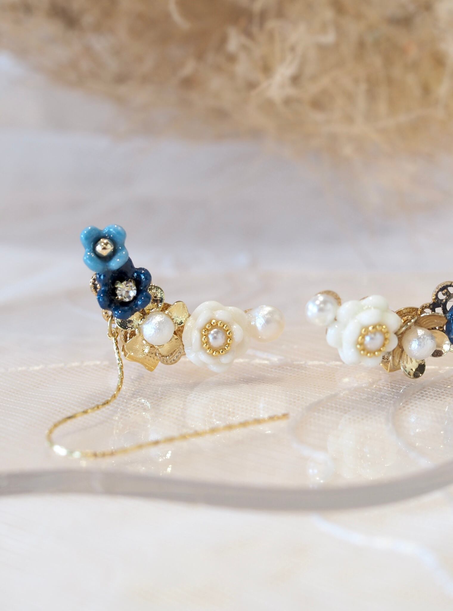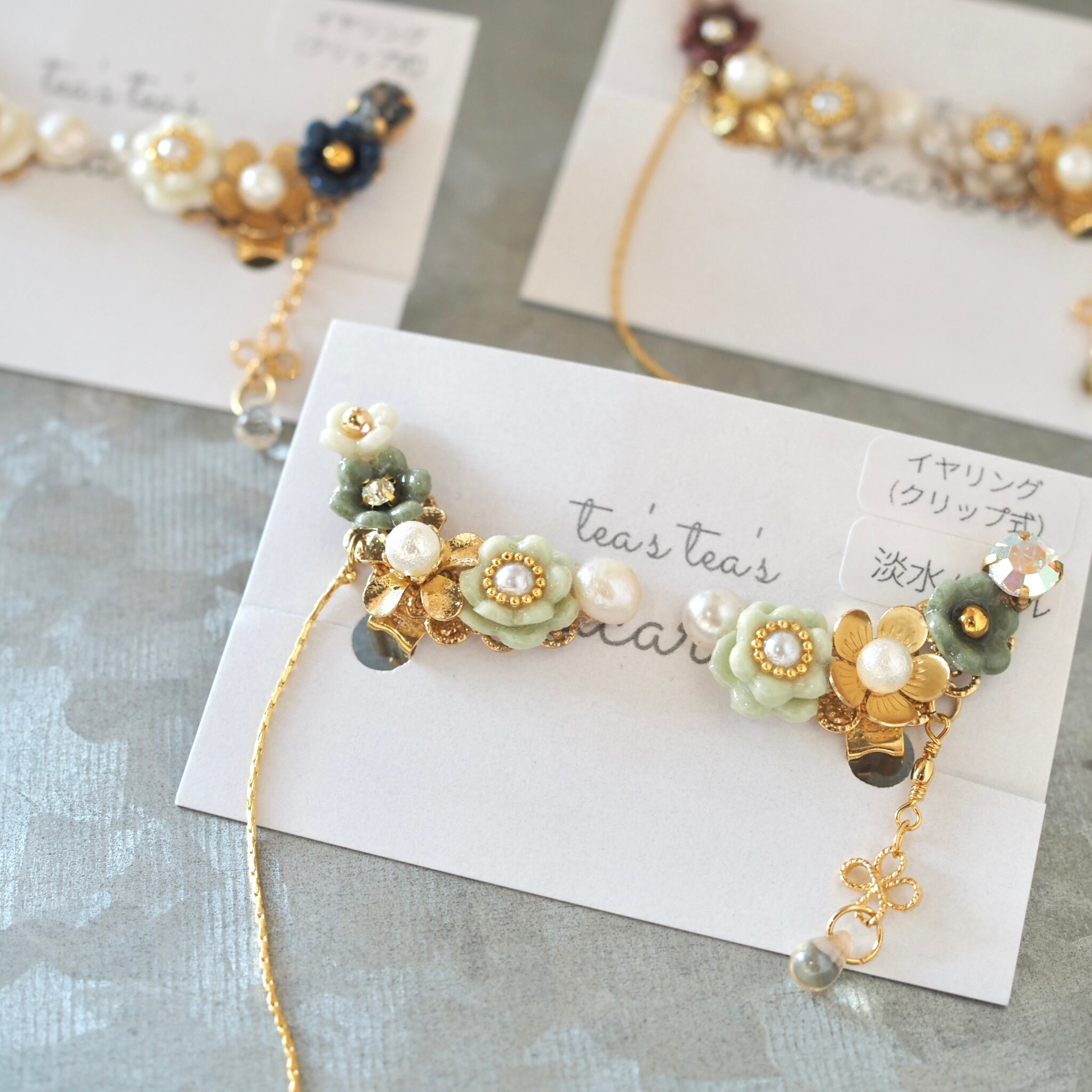 お花パーツとプレシオサビジュー、淡水パールなどを組み合わせた、シンメトリーデザイン。
