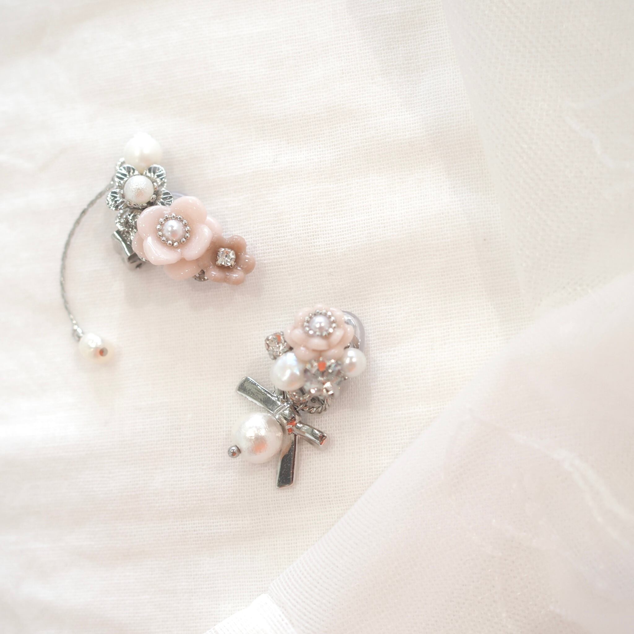 【新作】ピンク×リボン シルバーフラワーイヤーカフセット