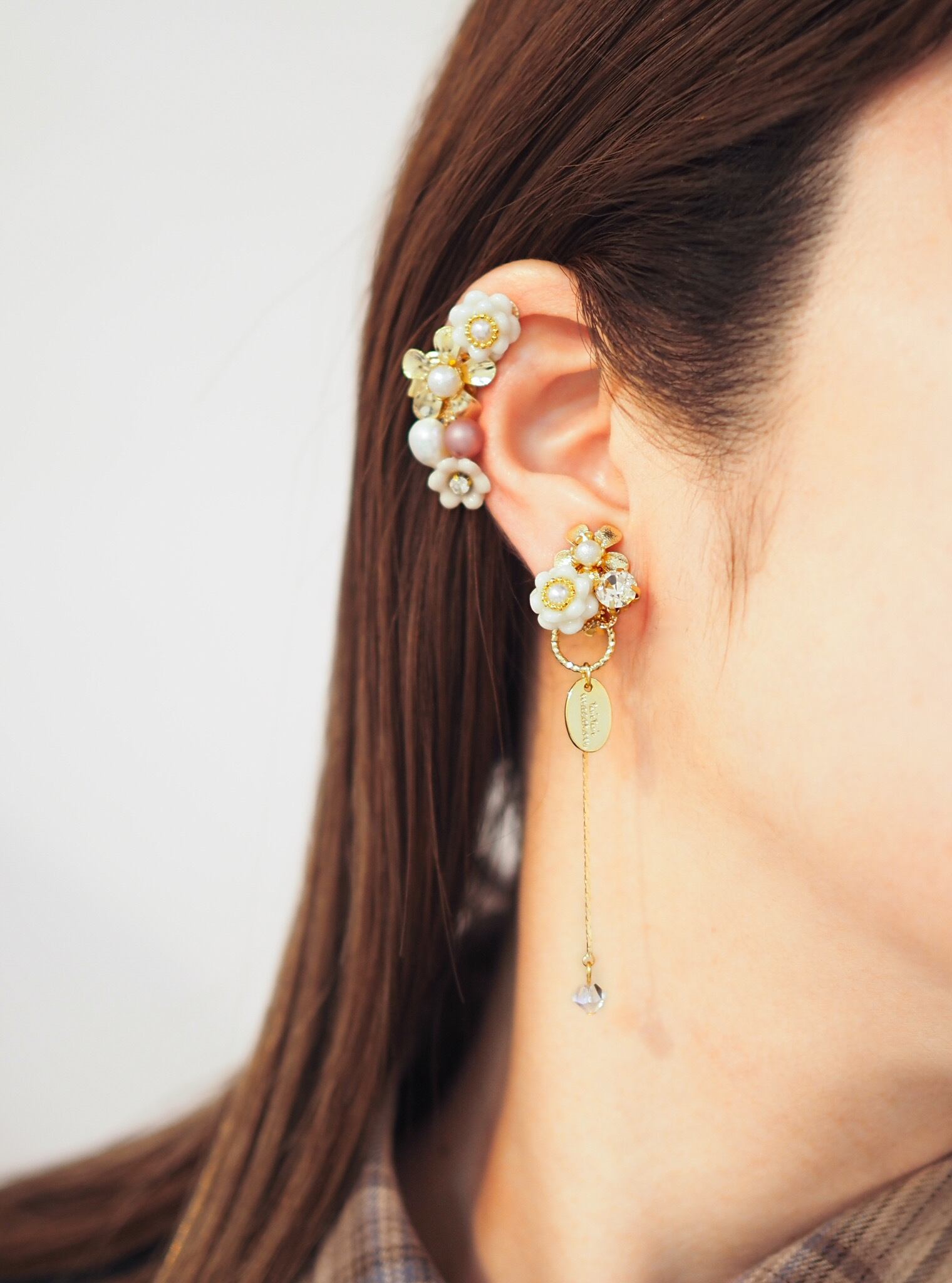 ⚪︎耳に沿うイヤーカフデザインと、揺れるデザインのアシンメトリーで、どちらから見ても華やかな横顔を演出いたします。