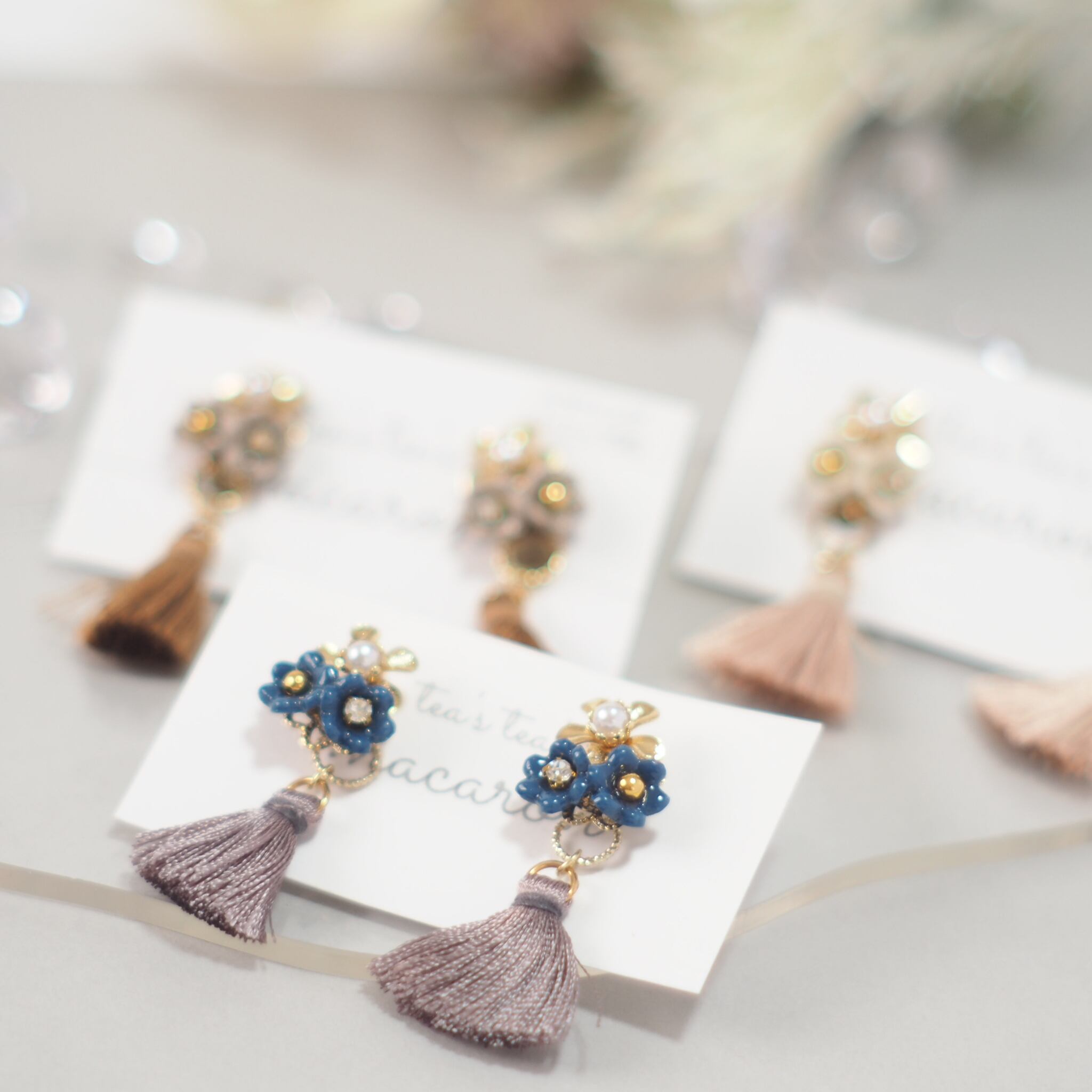 (ピアスは、キャッチがシンプルなものとタッセル付きのもので二重になっております)
